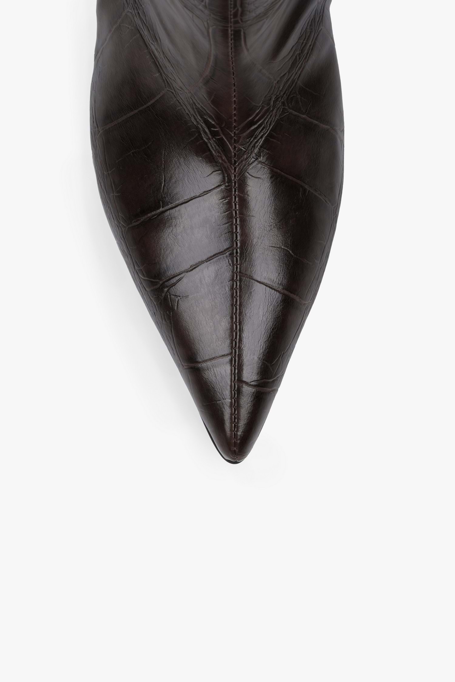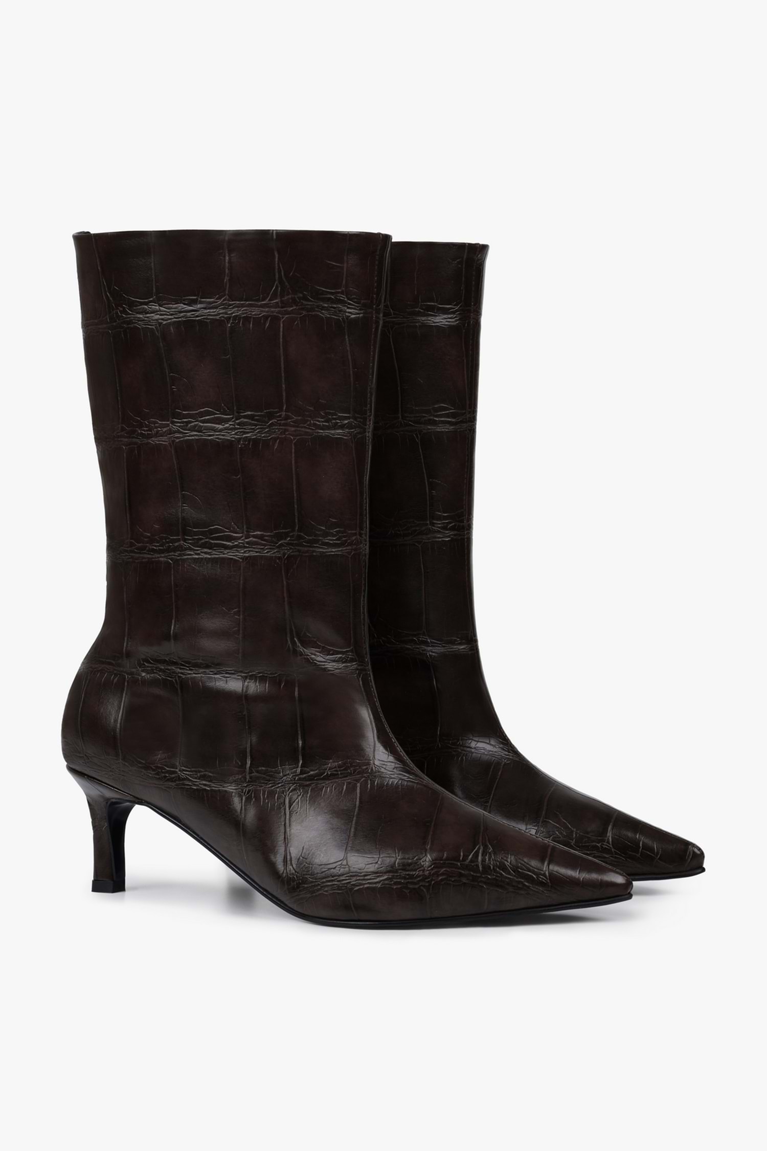 Klasik zarafeti modern bir dokunuşla buluşturan Velina Bot, kroko desenli yüzeyi ve ince topuğuyla dikkatleri üzerine çeker. Diz altı boyu ve sivri burun formuyla hem elbiselerle hem de jeanlerle kusursuz bir uyum yakalar. Tarzını sofistike bir dokunuşla tamamla.