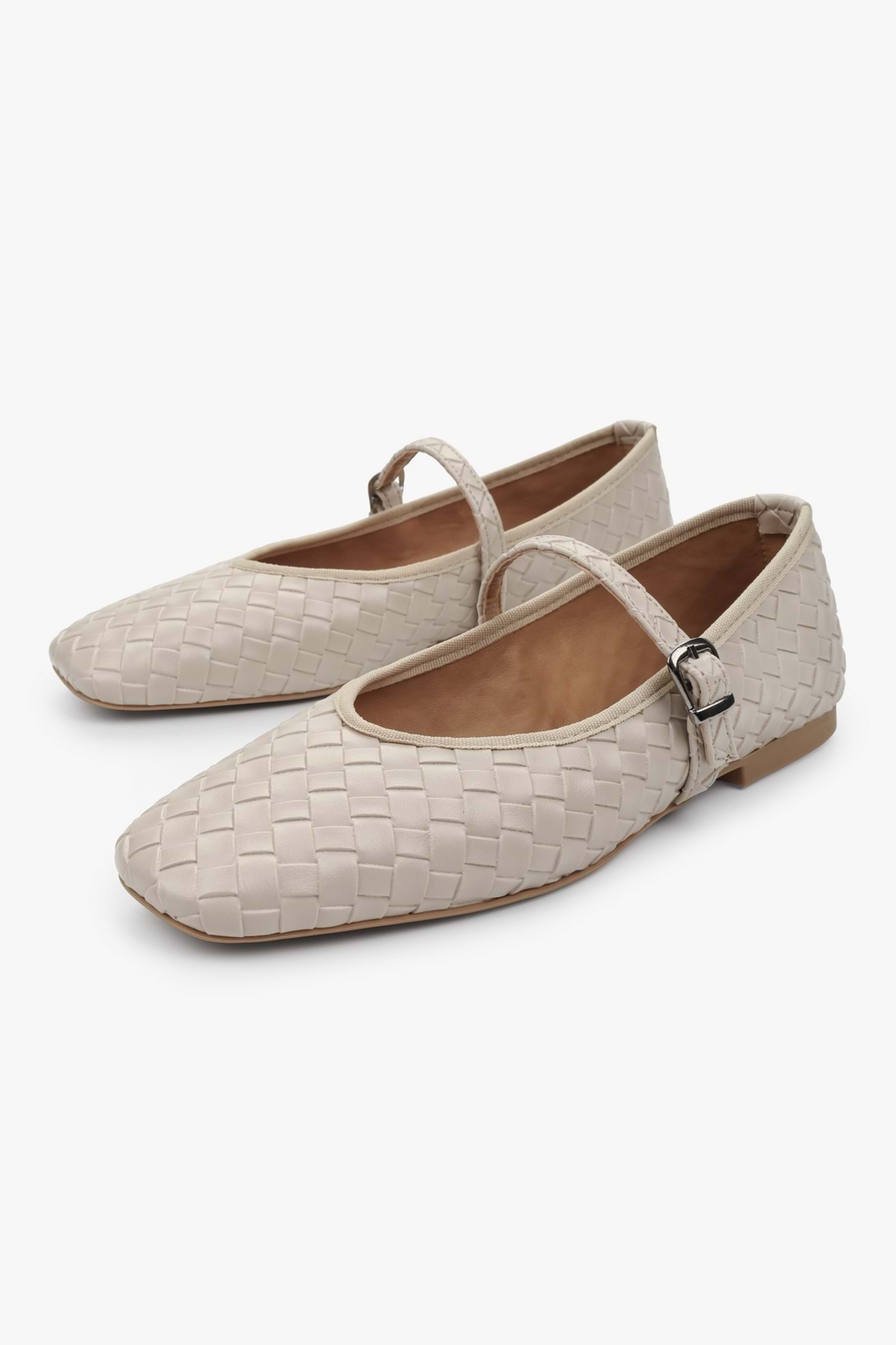 Kaliteli örgü deri dokusu, kare burun şıklığı ve ince bilek bandı ile her adımında naif ama iddialı bir duruş sunar.