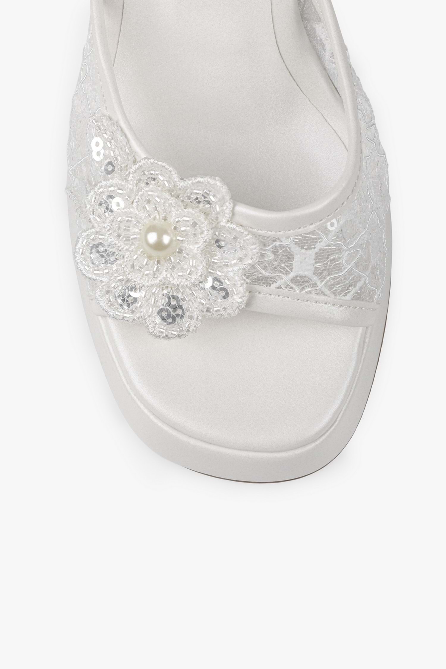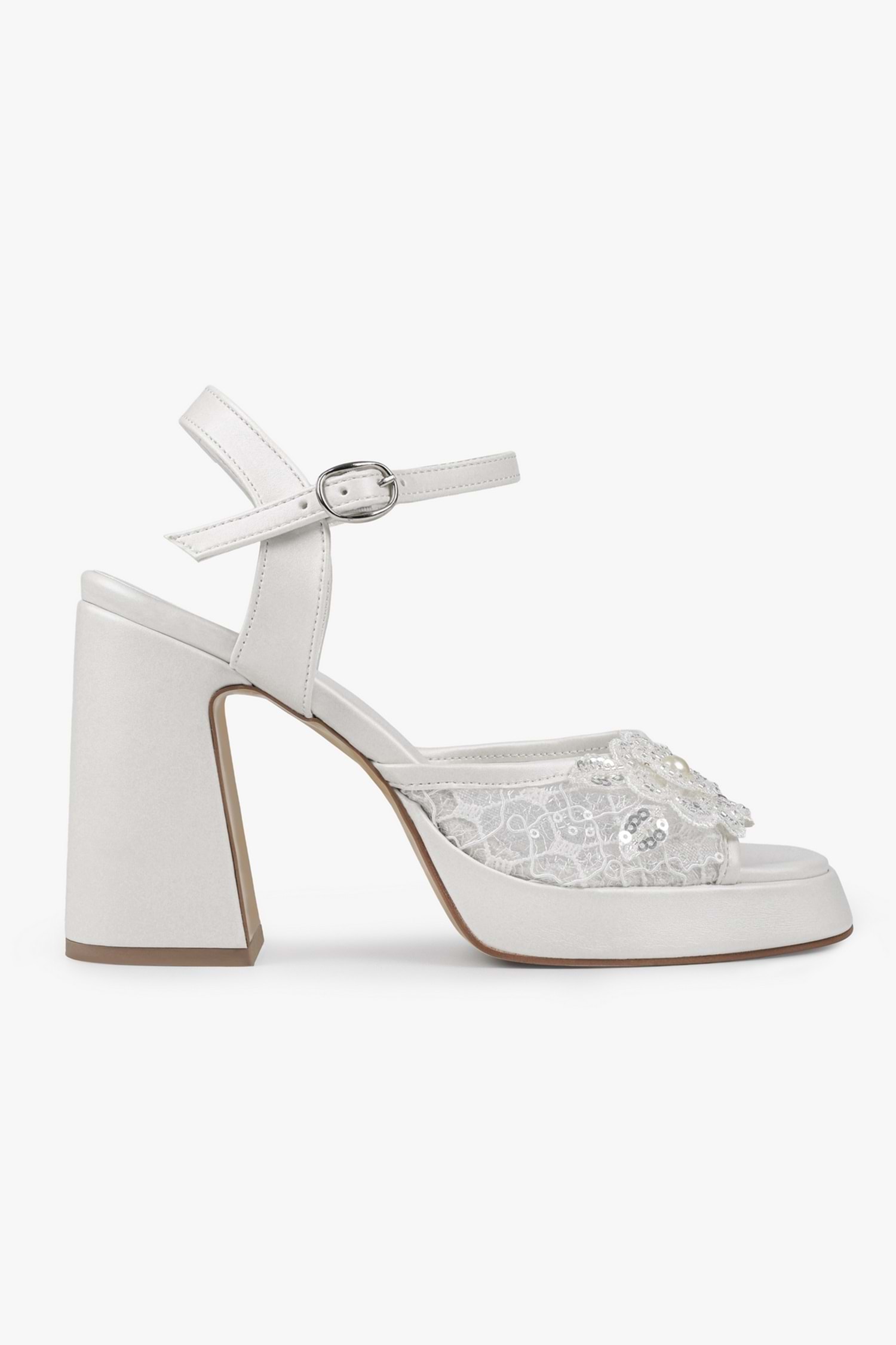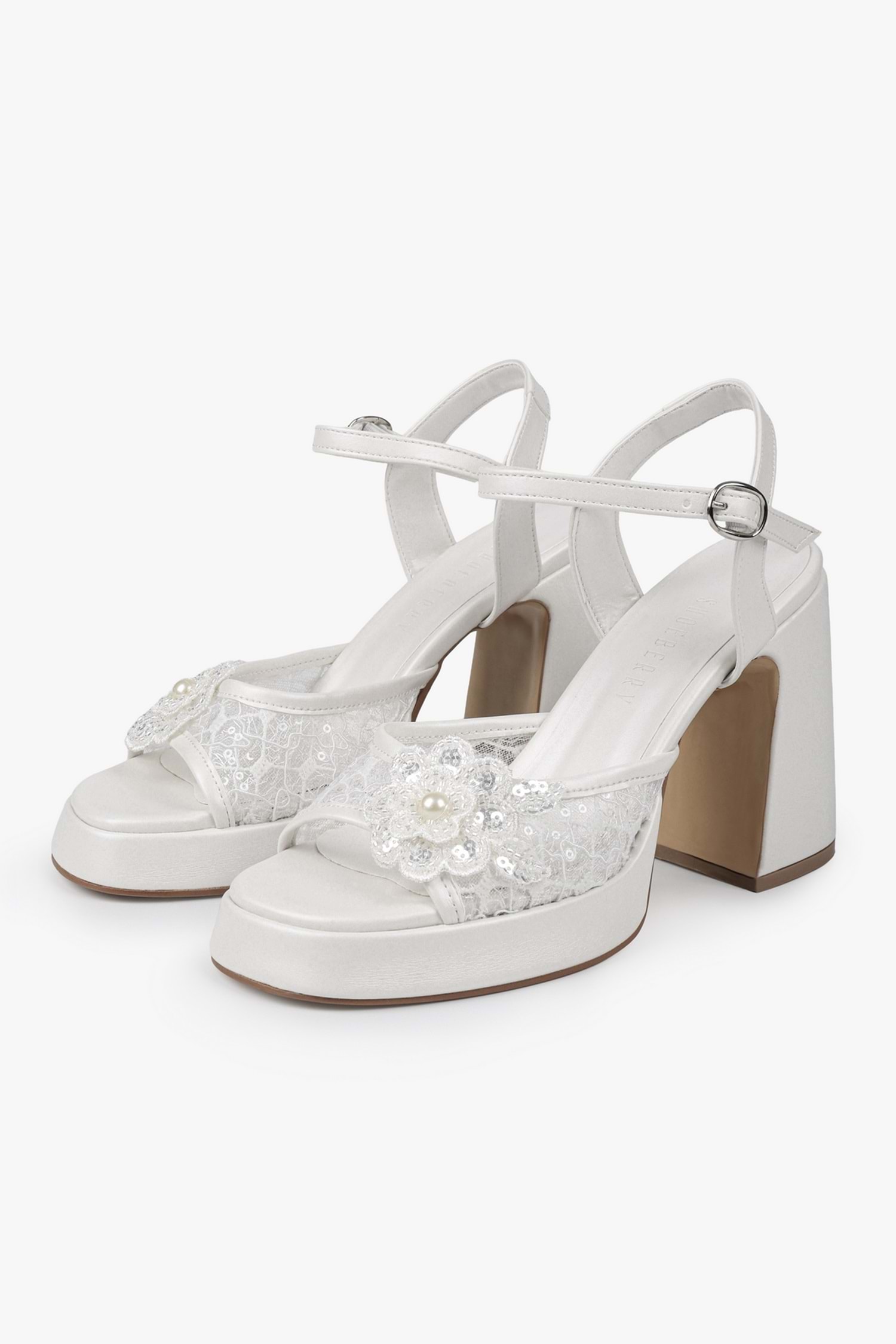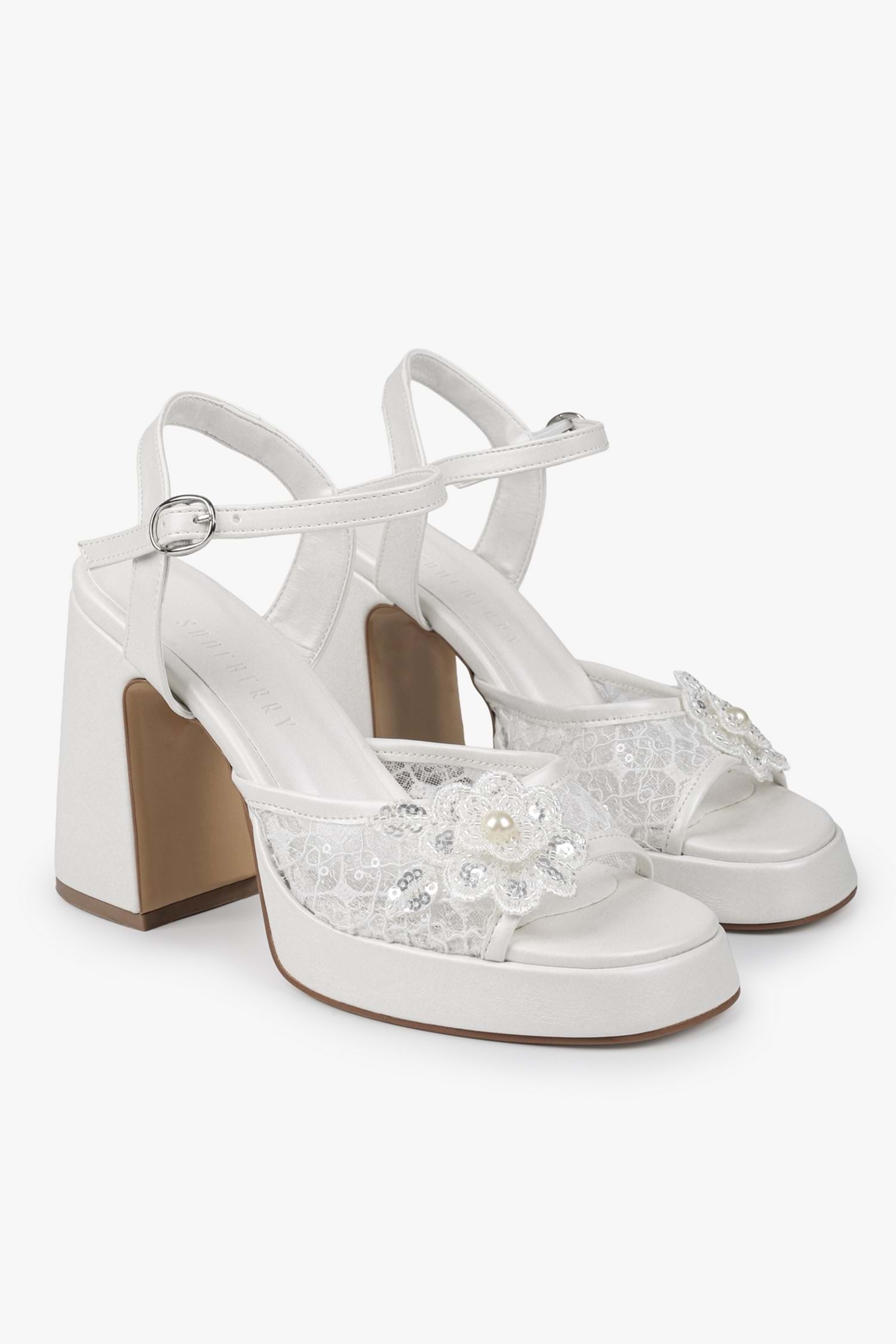 Velia platform topuklu ayakkabımız, dantel detaylı yüzeye sahip, açık burun formunda tasarlanmış ve yüksek blok topuk yapısıyla tamamlanmıştır. Ön platform tabanı, ayarlanabilir bilek bandı ve çiçek form aplikeli ön bant detayı ile desteklenen bir modeldir.