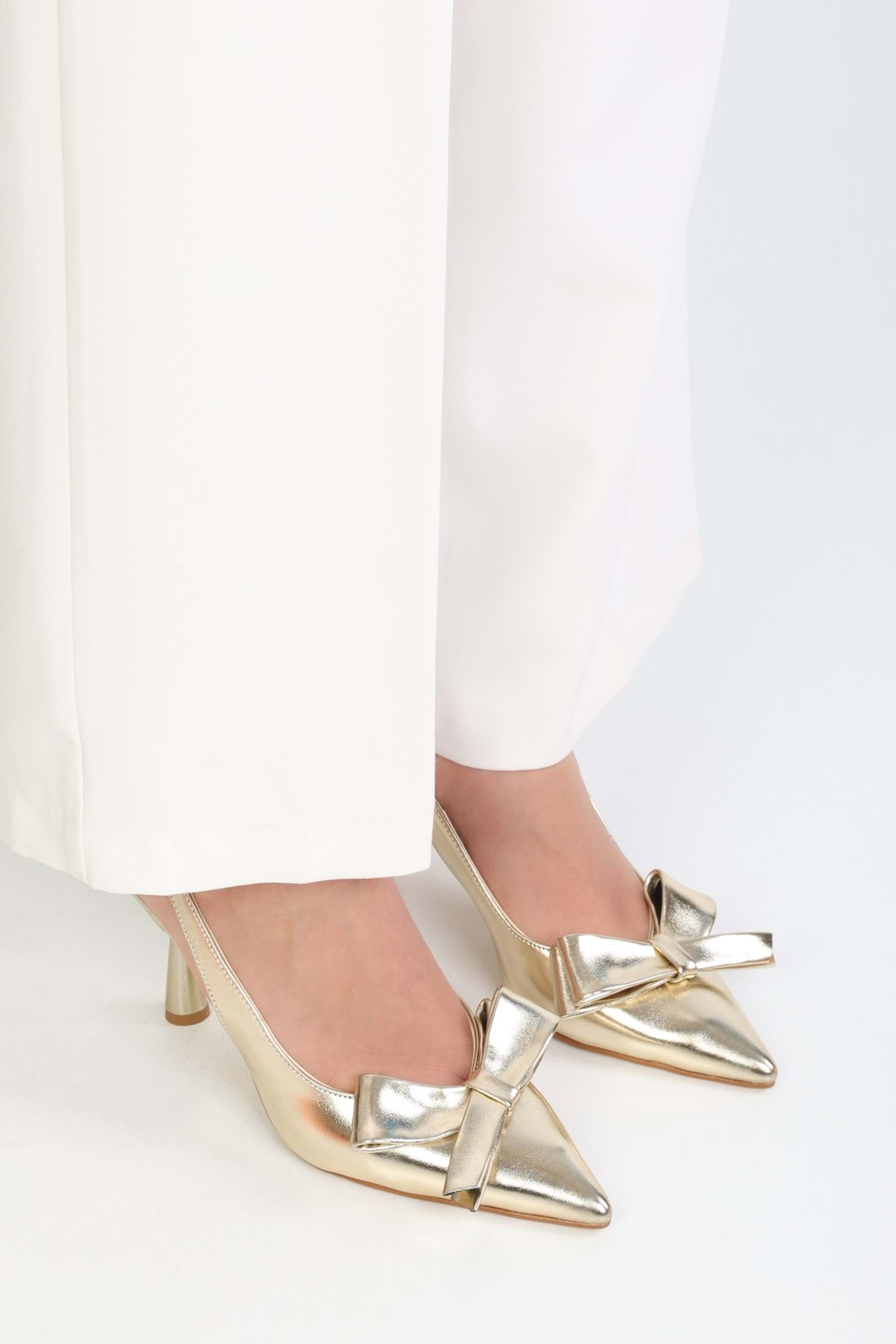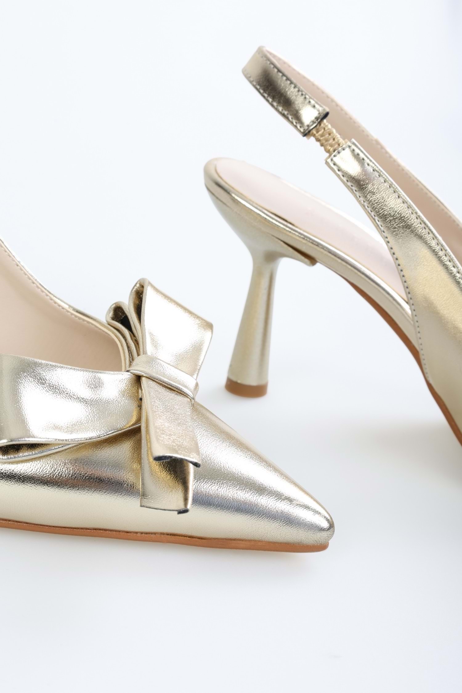 Fiorella stilettomuz, parlak rugan yüzeyi ve zarif fiyonk detayıyla feminen şıklığın en zarif halini yansıtır. İnce topuğu ve sivri burun tasarımı modern bir silüet sunarken, slingback modeli rahat bir kullanım sağlar. Özel davetlerden şık günlük kombinlere kadar her ortamda stilinizi romantik bir dokunuşla tamamlayacak göz alıcı bir parça.