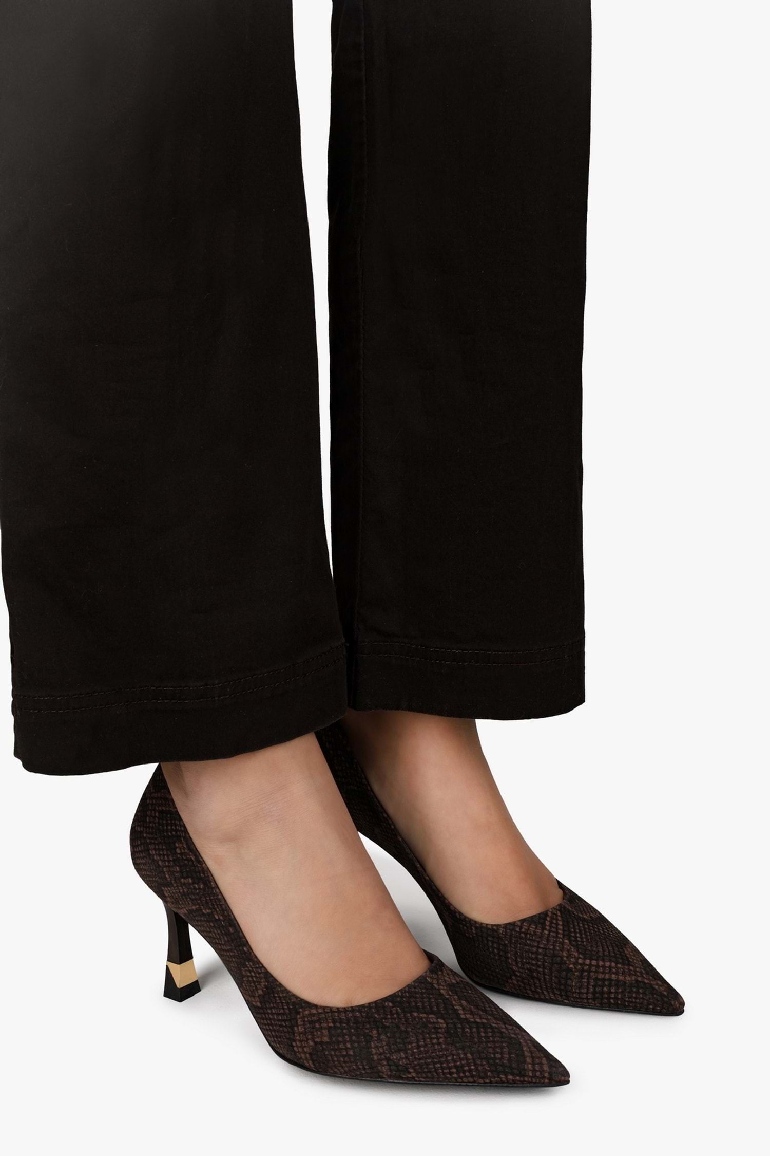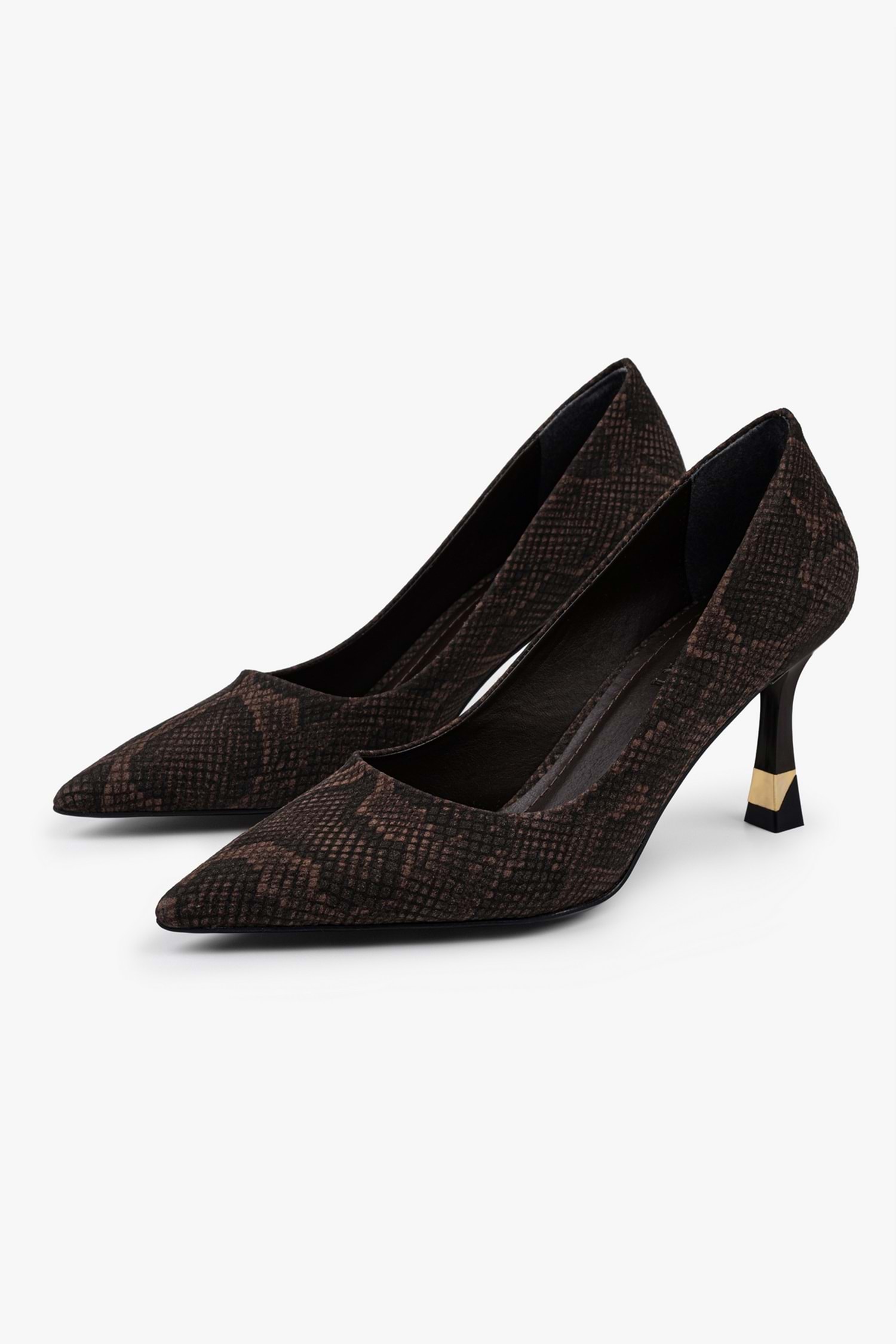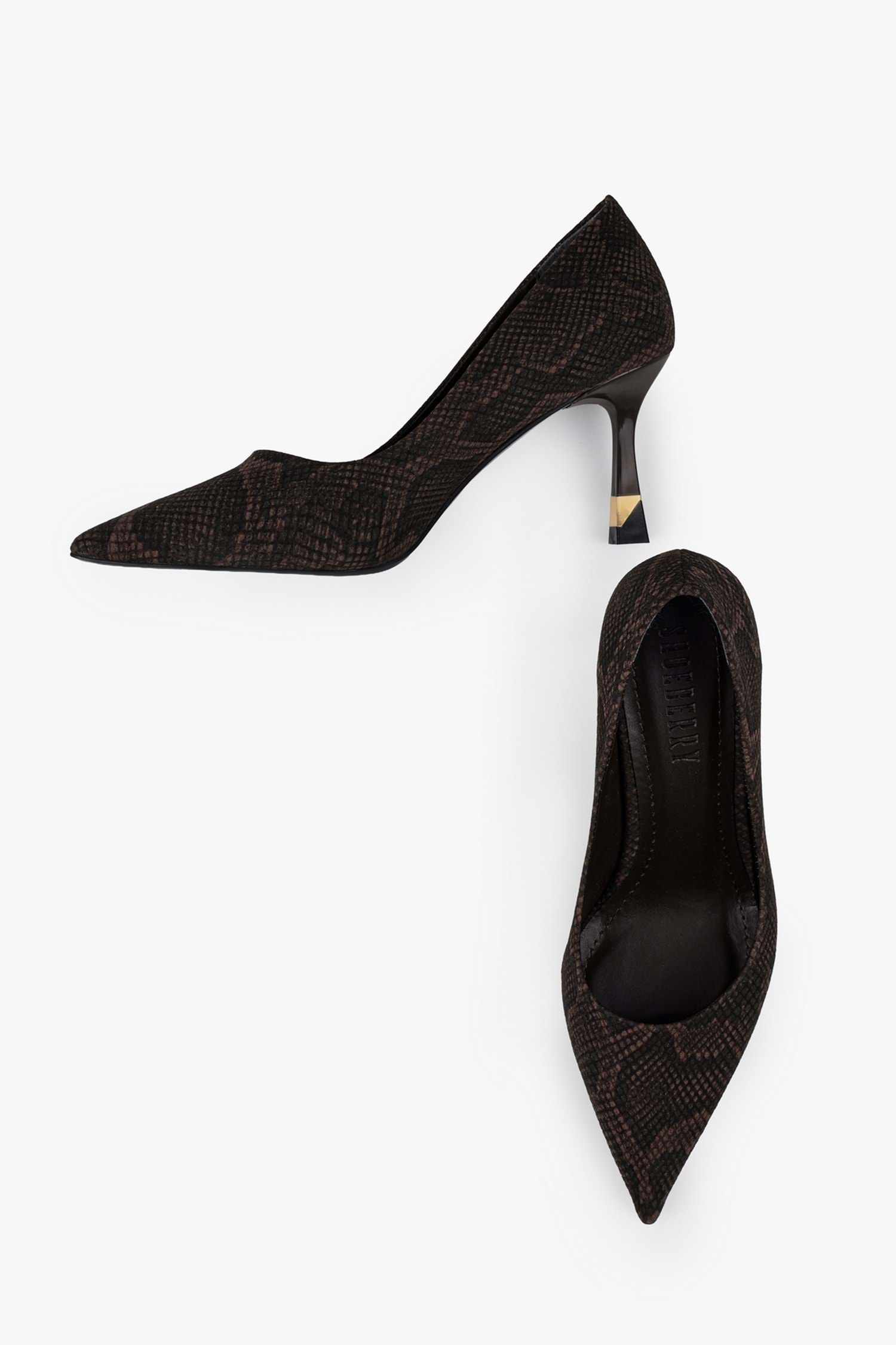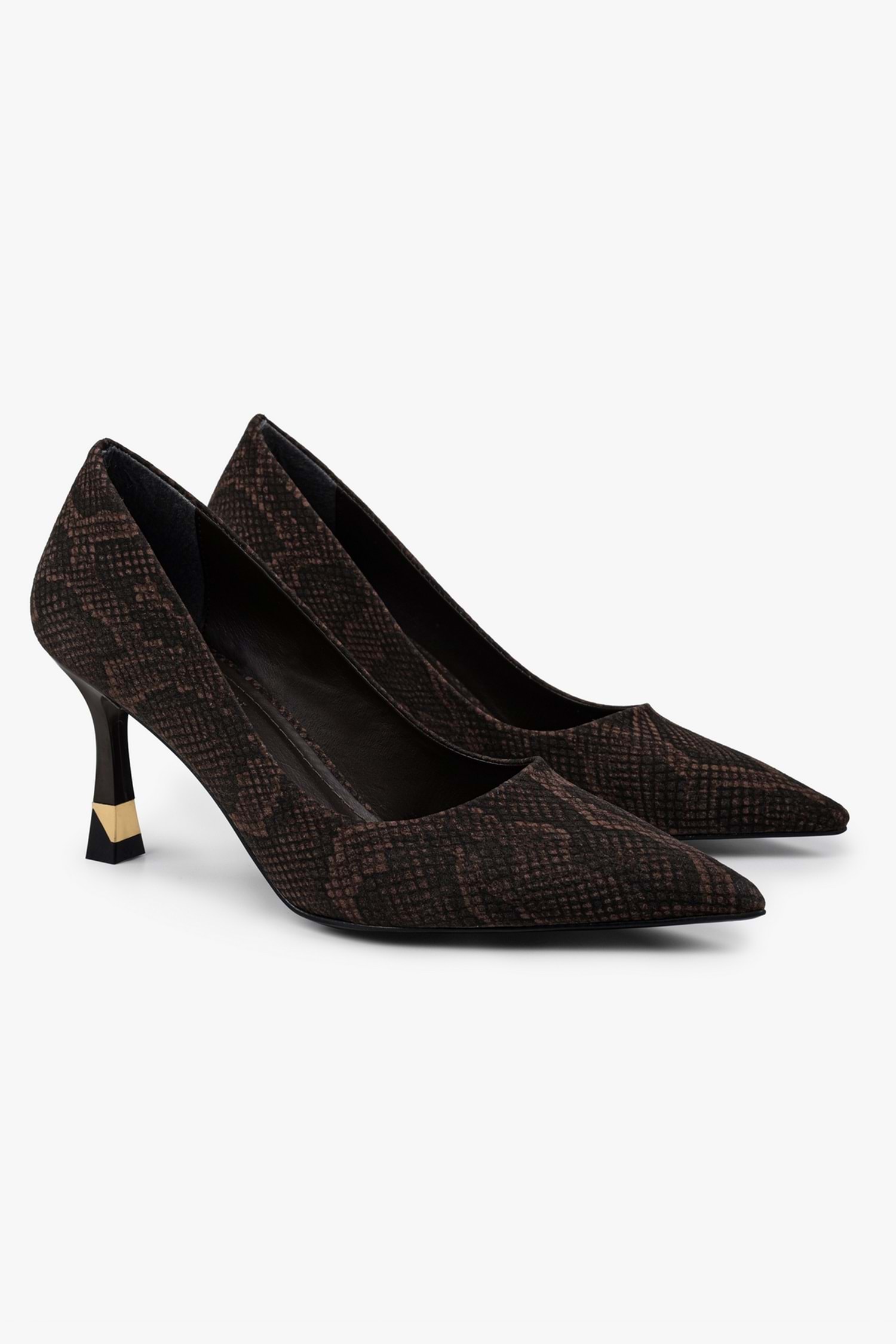 Gilda stilettomuz, yılan desenli yüzeye sahip, sivri burun formunda tasarlanmış ve altın renk detaylı özel form ince topuk yapısıyla tamamlanmış bir modeldir.
