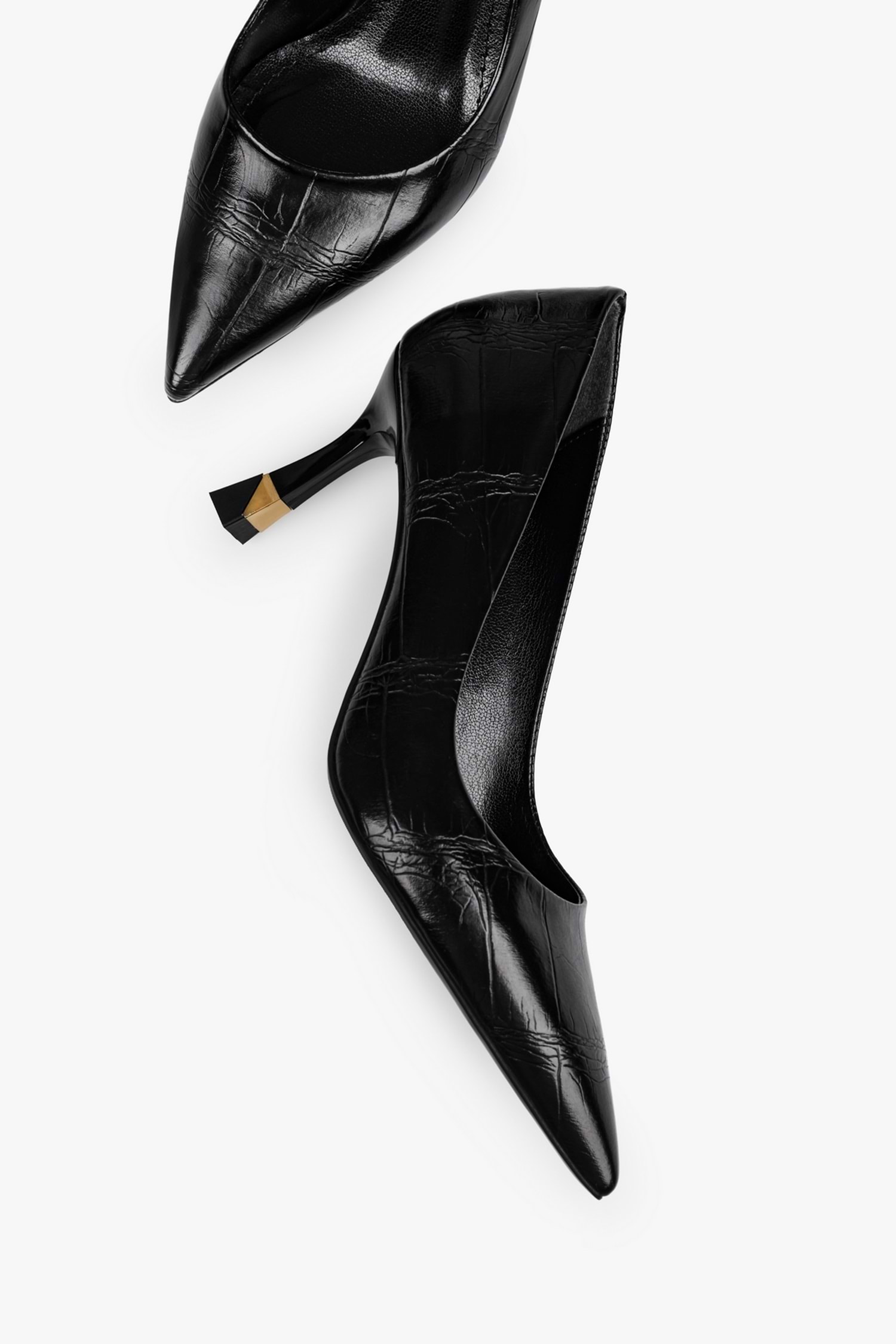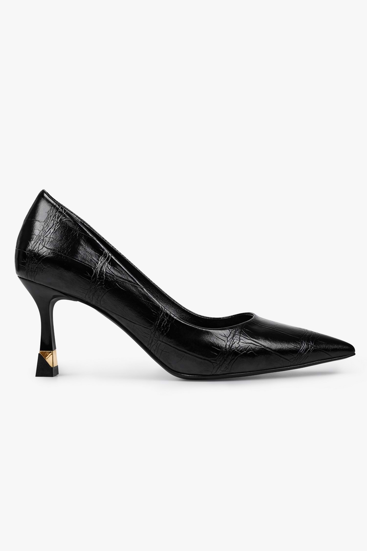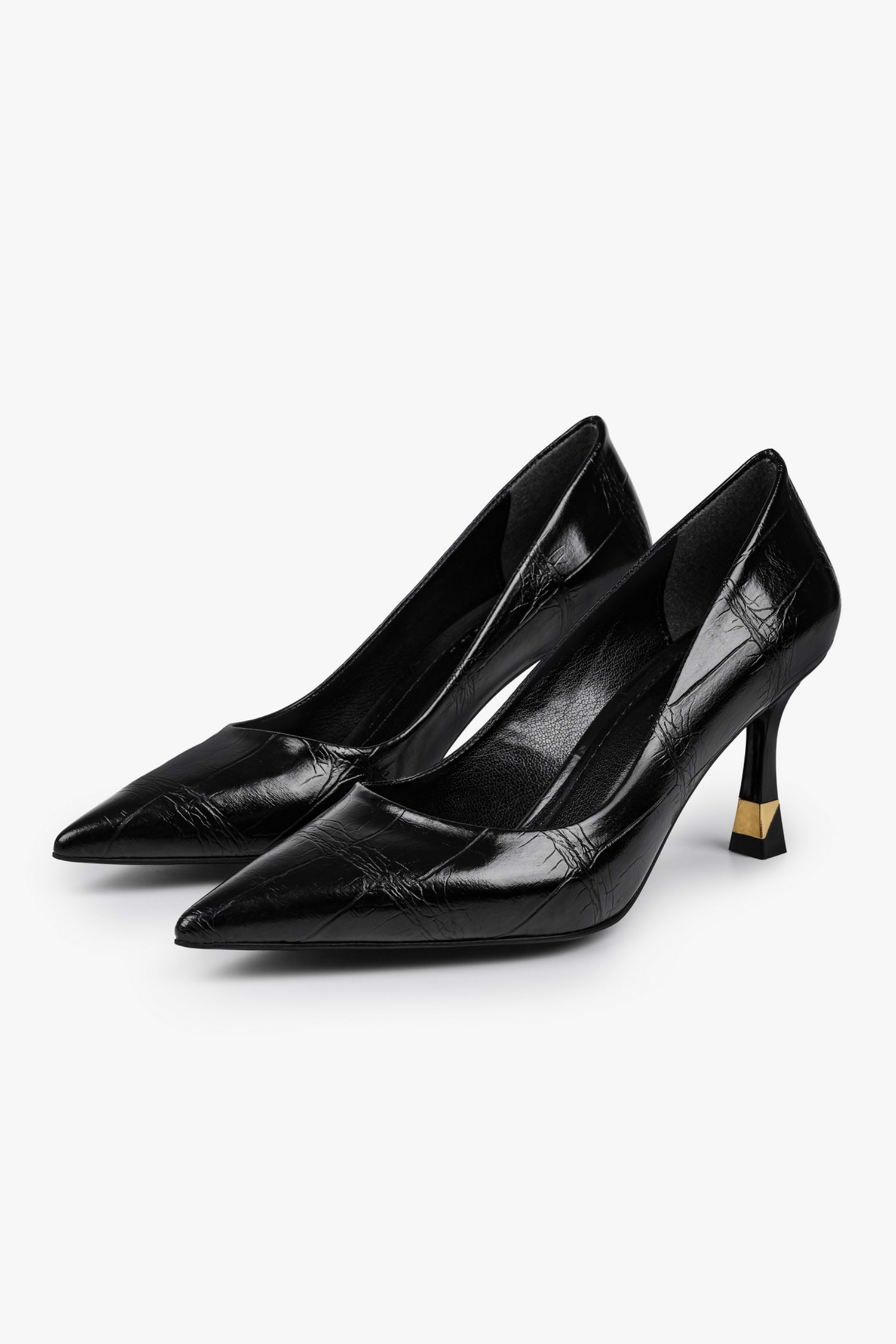 Gilda stilettomuz, parlak dokulu yüzeye sahip, sivri burun formunda tasarlanmış ve altın renk detaylı özel form ince topuk yapısıyla tamamlanmış bir modeldir.