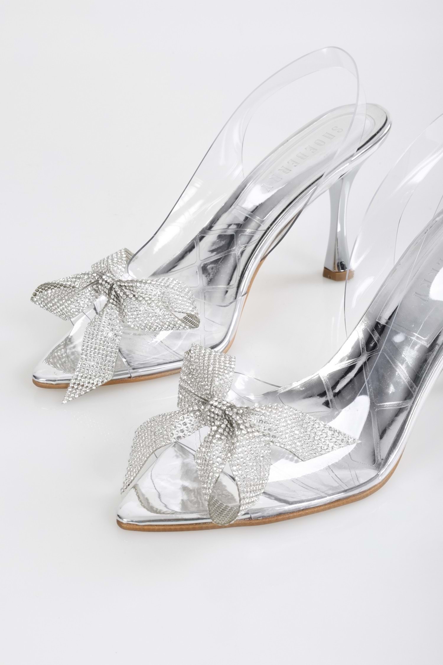 Şeffaf, fiyonk detaylı sivri burun stiletto. Topuk boyu 9 cm'dir. Şık bir tasarımı mevcuttur. Oldukça konforludur. Ürün görselleri Shoeberry Markası tarafından çekilmiştir. %100 el işçiliği ile Shoeberry Atölyesinde üretilmiştir.